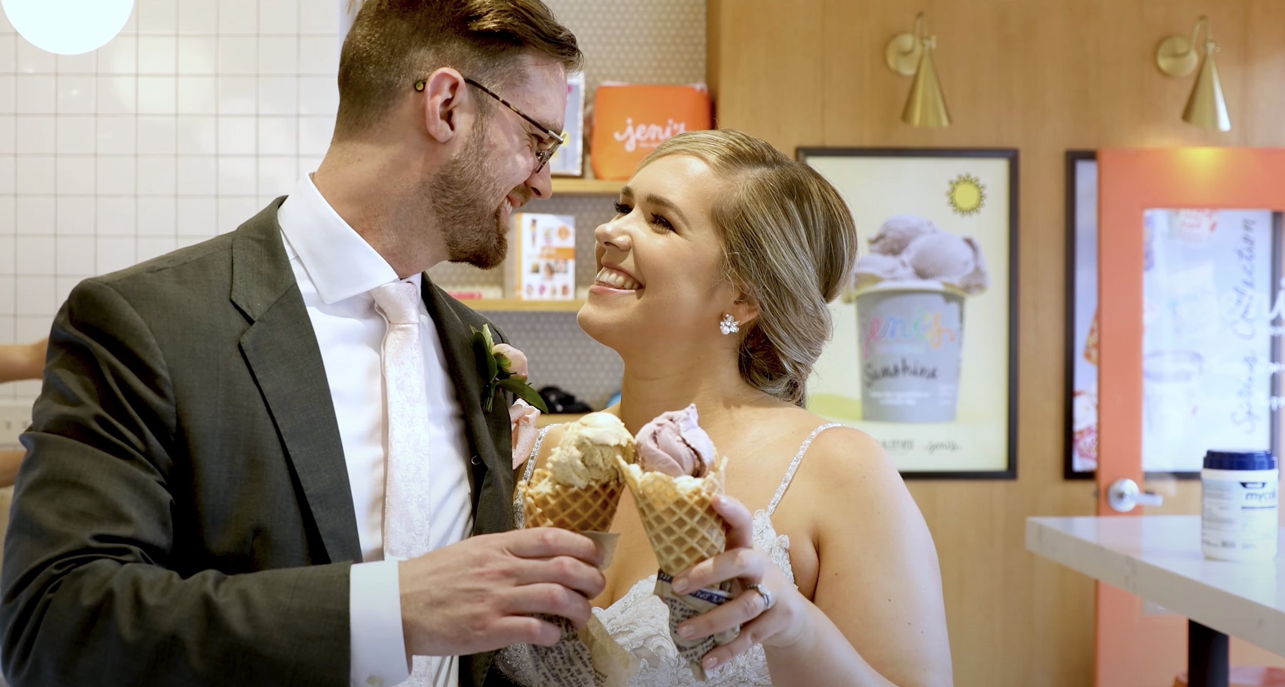 As they stood under gray skies and felt the cool droplets on their skin, they embraced the unexpected weather with joy and enthusiasm. Determined to make the most of their special day, even with the broken down wedding bus, happily walked a mile to Jeni’s, with photographers, cinematographers, and wedding coordinators in tow. Inside, surrounded by the sweet aroma and vibrant colors of frozen treats, their spirits soared. With laughter and glee, they indulged in their favorite flavors, playfully feeding one another scoops of happiness.